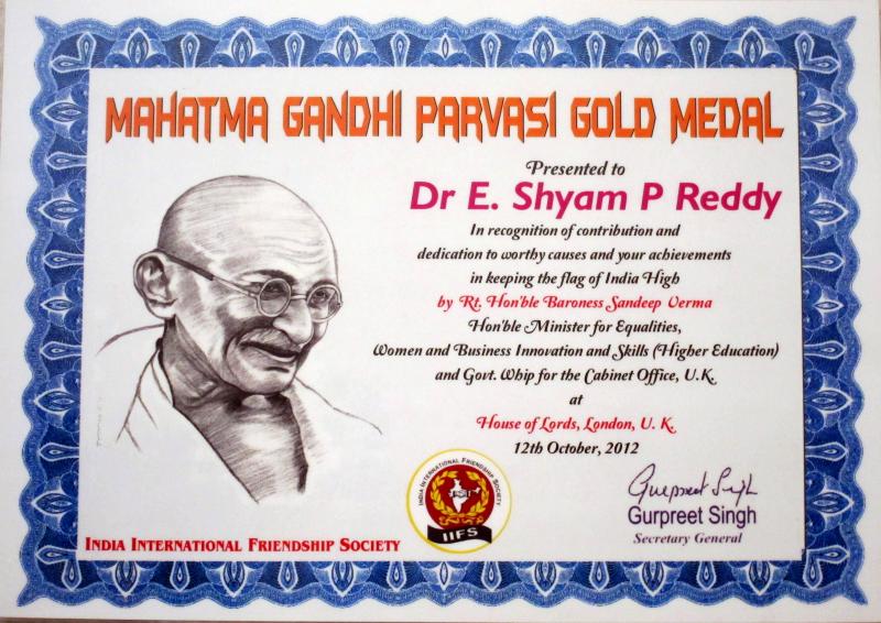 Dr Shyam Reddy was awarded the prestigious MAHATMA GANDHI PRAVASI GOLD MEDAL during IIFS function of Global Achievers Conclave at the HOUSE OF LORDS, Parliament, London, UK.